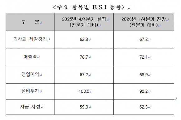 업종별로 기계(25.0), 비금속광물(33.3), 섬유(50.0), 목재·제지(71.4), 음·식료품(80.0), 금속 및 화학(각각83.3) 업종이 기준치인 100보다 낮은 수치를 나타냈으며, 전기·전자(133.3) 제조업은 기업경기가 전분기보다 호전될 것으로 조사됐다.