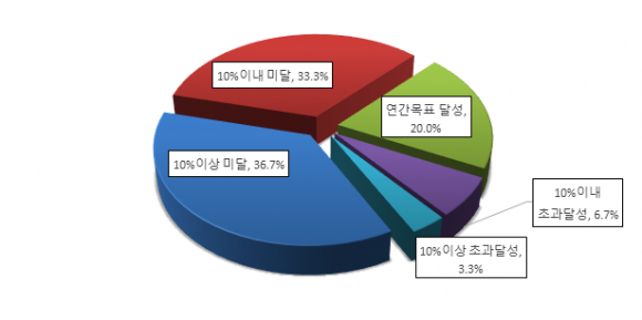 영업이익은 연초 목표대비 어느정도인가 물음에는 ‘10%이상 미달’(36.7%), ‘10%이내 미달’(33.3%), ‘연간목표 달성’(20.0%), ‘10%이내 초과달성’(6.7%), ‘10%이상 초과 달성’(3.3%)으로 답했다.