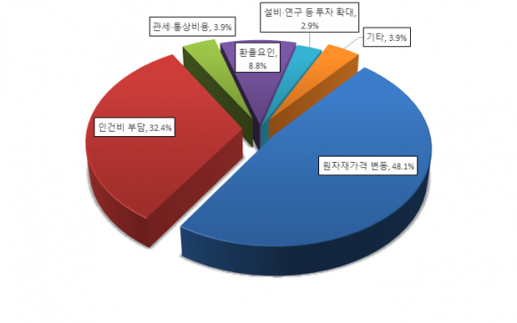 조사대상 업체의 올해 영업이익에 가장 부담되었던 요인은 무엇인가 물음에 ‘원자재가격변동’(48.1%), ‘인건비 부담’(32.4%), ‘환율요인’(8.8%)