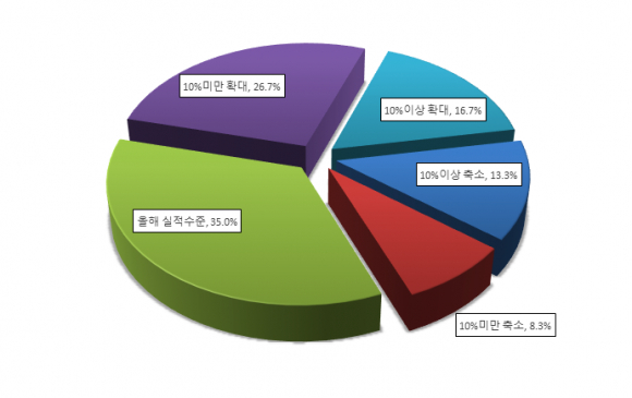 이어서 내년도 내수실적 목표치를 올해 실제 달성한 실적대비 어느수준으로 설정하였는지 질문에 ‘올해 실적수준’(35.0%), ‘10%미만 확대’(26.7%), ‘10%이상 확대’(16.7%), ‘10%이상 축소’(13.3%), ‘10%미만 축소’(8.3%)로 나타났으며,