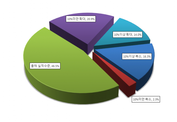 수출실적 목표치는 올해 실제 달성한 실적대비 어느수준으로 설정하였는지 물음에는 ‘올해 실적수준’(46.5%), ‘10%미만 확대’(20.9%), ‘10%이상 축소’(16.3%), ‘10%이상 확대’(14.0%), ‘10%미만 축소’(2.3%)로 답했다.