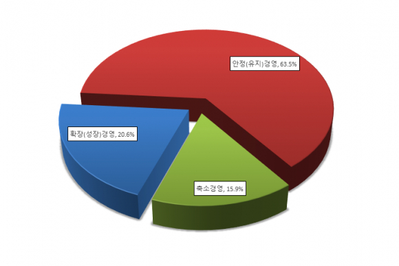 조사 업체의 내년도 경영계획의 핵심 기조는 무엇인지 물음에 ‘안전(유지)경영’(63.5%), ‘확장(성장)경영’(20.6%), ‘축소경영’(15.9%)으로 답했으며,
