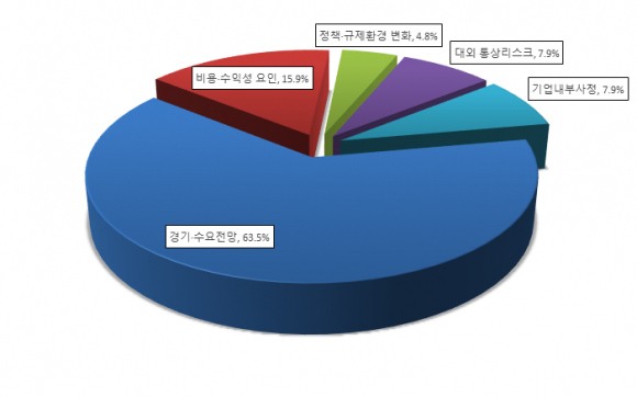 내년도 경영계획 수립에 가장 큰 영향을 미친 핵심 변수는 무엇인지에는 ‘경기·수요전망’(63.5%), ‘비용·수익성 요인’(15.9%), ‘대외 통상리스크’ 및 ‘기업내부사정’(각각 7.9%), ‘정책·규제환경 변화’(4.8%) 로 조사됐다.