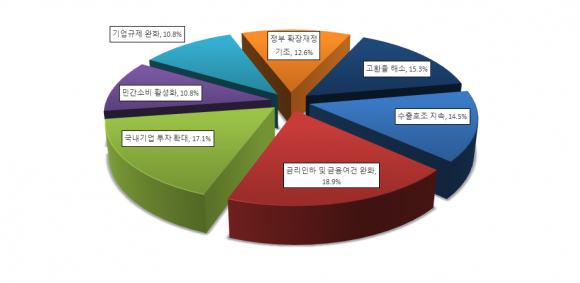 조사 업체의 내년도 한국 경제 성장을 견인할 주요 긍정 요인은 무엇이라고 생각하는지 물음에 ‘금리인하 및 금융여건 완화’(18.9%), ‘국내기업 투자 확대’(17.1%), ‘고환율 해소’(15.3%), ‘수출호조 지속’(14.5%), ‘정부 확장재정 기조’(12.6%), ‘기업규제 완화’ 및 ‘민간소비 활성화’(각각 10.8%)로 대답했다.