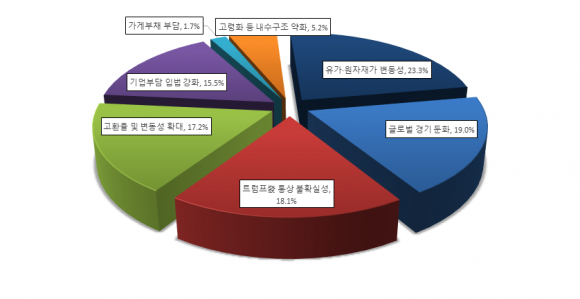 %), ‘트럼프發 통상 불확실성’(18.1%), ‘고환율 및 변동성 확대’(17.2%), ‘기업부담 입법강화’(15.5%), ‘고령화 등 내수구조 약화’(5.2%), ‘가게부채 부담’(1.7%)순으로 답했다.