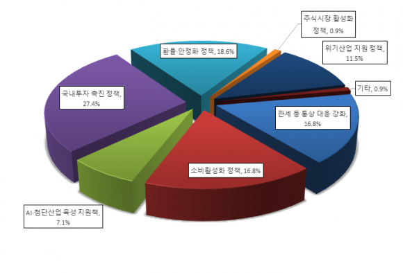 2026년 경제 활성화 및 기업 실적 개선을 위해 정부는 어떤 정책을 중점적으로 추진해야한다고 생각하는지 물음에 ‘국내투자 촉진 정책’(27.4%), ‘환율·안정화 정책’(18.6%), ‘소비활성화 정책’, ‘관세 등 통상 대응강화’(각각 16.8%), ‘위기산업 지원 정책’(11.5%), ‘AI·첨단산업육성지원책’(7.1%) ‘주식시장 활성화 정책’(0.9%), ‘기타’(0.9%)로 나타났다.