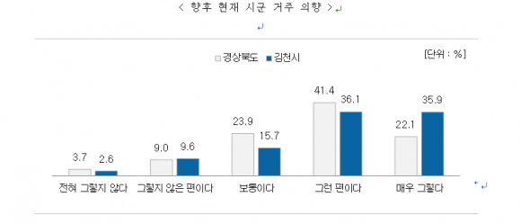 ■ 정주 의향 높음 향후 김천시에 계속 거주하겠다는 응답은 72%로 경상북도 전체보다 약 8.5% 높은 수준이다.
