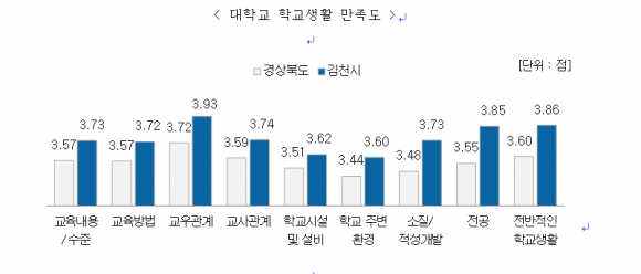 ■ 교육환경 전반적으로 우수(5점 만점) 학교생활 만족도는 교우관계·시설 항목에서 특히 높았으며, 대학생 만족도는 도 평균보다 더 높게 나타났다. 또한, 초등학교 생활 만족도에서는 학교시설 및 설비 만족도가 타 항목에 비해 높게 나타났으며, 중고등학교 전반적 학교생활 만족도도 도 평균 대비 미미하게 상회하는 것으로 나타났다.