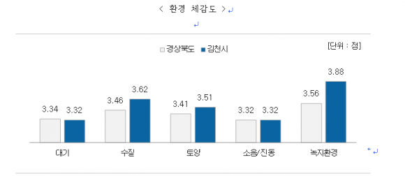 ■ 환경 체감도 항목 중 녹지환경이 3.88점(5점만점)으로 가장 높음 이어, 수질 3.62점, 토양 3.51점, 대기, 소음/진동 각 3.32점 순으로 나타났으며, 대기환경의 경우 경상북도 3.34보다 0.02점 낮게 나타났다.