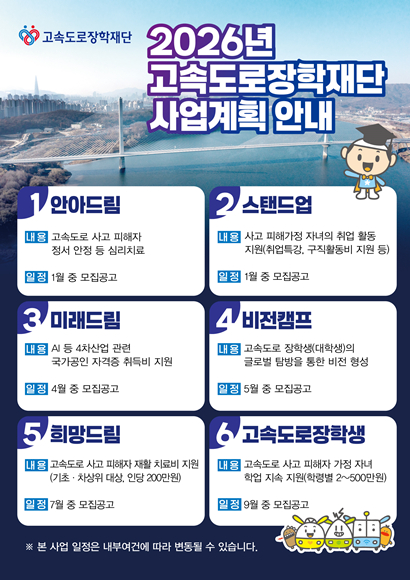 올해는 운영 기간을 8개월(3∼10월)에서 11개월(2∼12월)로 확대하고, 거주지 인근 상담사 매칭으로 1:1 대면 맞춤형 상담을 확대해 상담 효과를 높일 예정이다. 또한, 전화·방문 등을 통한 정밀 심리상담, 부모·자녀와의 관계 개선, 학생을 위한 진로상담 등 맞춤형 지원도 함께 진행한다. 참여 방법은 고속도로장학재단 홈페이지(www.hsf.or.kr)에 게시된 양식을 작성해 이메일(expressway@hsf.or.kr)로 제출하면 된다. 한편, 한국도로공사는 1998년부터 지난해까지 총 7,274명에게 약 134억 원의 장학금을 지급했으며, ‘안아드림’ 외에도 고속도로 사고 피해자들의 일상 회복과 자립을 위한 다양한 프로그램을 운영하고 있다. 1월에는 ‘스탠드업(취업 지원)’ 프로그램을 공고할 예정이며, 4월 ‘미래드림’(자격증 취득비 지원), 5월 ‘비전캠프’(글로벌 탐방), 7월 ‘희망드림’(재활 치료비 지원), 9월에는 고속도로 장학생을 차례로 모집할 예정이다. 한국도로공사 관계자는 “고속도로 사고로 심리적 어려움을 겪고 있는 피해자 분들이 일상을 회복하고 희망찬 미래로 나아갈 수 있도록 지속적으로 노력하겠다”라고 말했다.