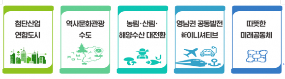 바이오산업은 제약·백신(포항·안동·예천), 그린바이오(포항·안동·상주·의성·예천), 푸드테크(포항·구미·의성), 메디컬․코스메틱(구미·경산) 등 분야별 핵심 시군을 육성하고, 미래 모빌리티(경주·김천·영주·영천·경산·칠곡), 방산(포항·경주·김천·구미·영주·의성) 연합모델도 추진한다.