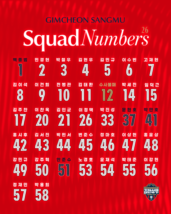 미드필더의 상징 8번은 김이석이 차지한다. 이건희는 공격수를 상징하는 9번을 골랐고, ‘에이스’를 상징하는 10번은 전병관의 몫이다. 지난 시즌 K리그1에서 가장 많은 공격포인트를 만들었던 김천상무의 14번은 박세진이 물려받았다. 김주찬은 측면 공격수가 주로 사용하는 17번을 달았다. 박태준이 원소속팀에서 사용하던 55번을 선택한 것도 눈에 띈다. 12기 신병선수 중 ‘맏형 라인’을 담당하는 이상헌, 강민규, 이강현은 각각 47번, 49번, 56번을 사용한다. 반면, ‘막내 라인’ 강주혁, 김서진, 정마호는 순서대로 50번, 43번, 46번을 배정받았다. 골키퍼는 1번 백종범을 시작으로 37번 문현호, 41번 박만호, 51번 안준수 순이다. 지난 1월 19일 입대로 가장 늦게 합류하게 되는 변준수는 45번을 달고 뛸 예정이다. 한편, 김천상무는 2월 28일 포항스틸러스와의 K리그1 홈 개막전으로 2026시즌을 시작한다.