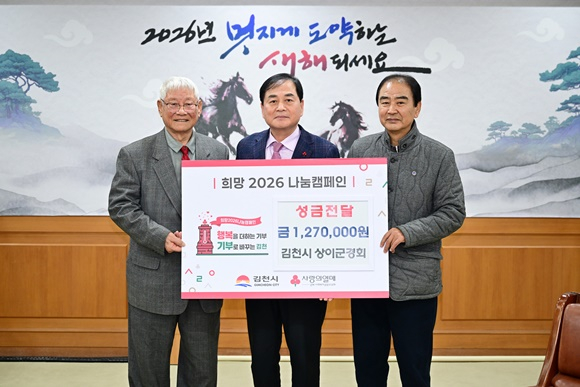 김천시(시장 배낙호)는 1월 19일 상이군경회 김천시지회(회장 선종두)로부터 희망2026나눔캠페인 성금 127만 원을 기탁받았다고 밝혔다.