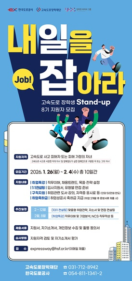 한국도로공사(사장 함진규)와 고속도로장학재단(이사장 이상재)은 고속도로 사고 피해자 및 피해 가정 자녀를 대상으로 1월 26일(월)부터 2월 4일(수)까지 취업 지원 프로그램 ‘Stand-up’ 8기 참가자를 모집한다고 밝혔다.