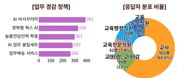 [업무 경감] 분야에서는 ‘AI를 통한 자동화’와 ‘인력 지원’에 대한 갈망이 직종별 업무 특성에 따라 다르게 표출됐다. 수업과 행정을 병행해야 하는 교사는 자잘한 잡무를 대신 처리해 줄 ‘AI 비서 꾸러미(52.1%)’를 선택해 ‘선생님을 아이들 곁으로’ 돌려보내는 정책을 1순위로 꼽았다.