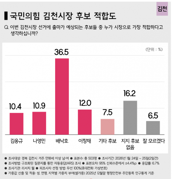 국민의힘 김천시장 후보 적합도 조사에서는 배낙호 후보가 36.5%로 가장 높은 지지를 얻었다. 이어 이창재 후보 12.0%, 나영민 후보 10.9%, 김응규 후보 10.4%로 나타났다. '지지 후보 없음'은 16.2%, '잘 모르겠다'는 6.5%, '기타 다른 후보'는 7.5%다.