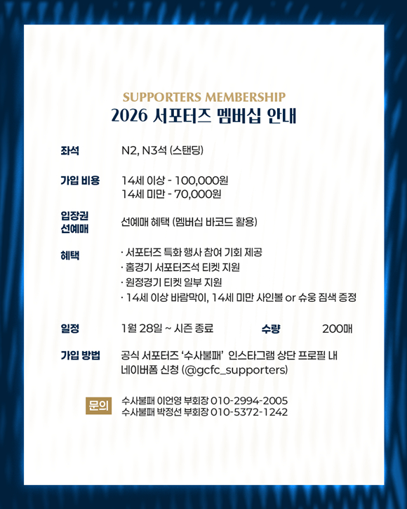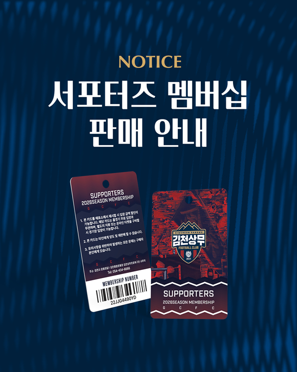 서포터즈 멤버십 가입은 ‘수사불패’ 공식 인스타그램(@gcfc_supporters) 프로필 상단에 안내된 네이버폼을 통해 신청할 수 있다. 가입 관련 문의는 수사불패 SNS에 게시된 관련 안내글 내 수사불패 임원진 연락처를 통해 가능하다. 한편, 김천상무의 2026시즌 홈 개막전은 2월 28일 포항스틸러스와의 ‘하나은행 K리그1 2026’ 1R 경기다.