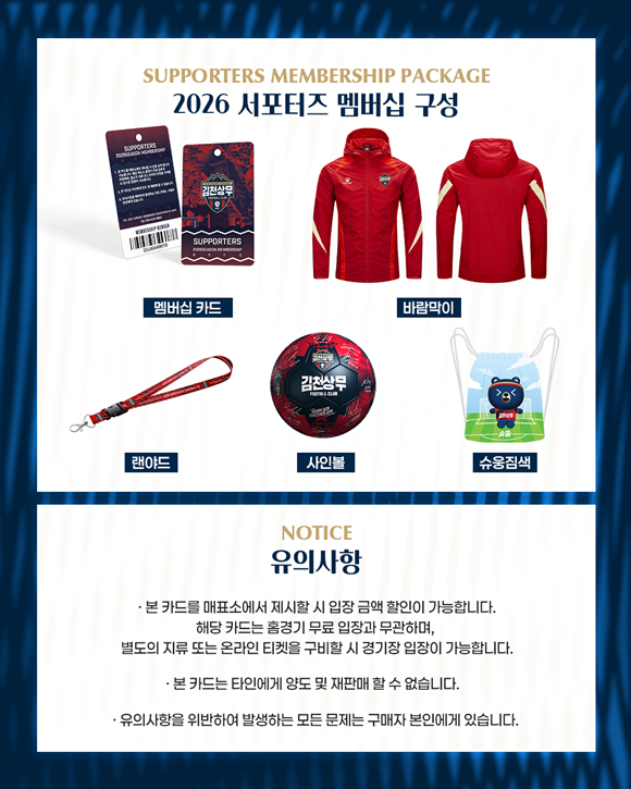 이번 서포터즈 멤버십은 ‘역대급 혜택’으로 구성되었다. 먼저 멤버십 회원은 김천상무 홈경기 시 선수들과 가장 가까운 곳에서 응원의 열기를 느낄 수 있는 서포터즈석(N2, N3구역) 입장권을 정액 7천 원에 구매할 수 있다. 동시에 가입회원 본인에 한해 서포터즈석 선예매가 가능하다. 다양한 이벤트 혜택도 있다. 서포터즈 특화 행사 참여 기회가 제공되며, 홈경기 서포터즈석 티켓 지원, 원정경기 티켓 일부 지원 혜택도 받을 수 있다. 멤버십 패키지 구성 또한 풍성하다. 서포터즈를 형상화한 멤버십 실물카드와 랜야드가 기본으로 제공되며, 14세 이상 가입자는 구단 공식 의류 후원사 켈미 바람막이를 받을 수 있다. 14세 미만 가입자는 구단 공식MD 사인볼 또는 ‘슈웅짐색’ 중 하나를 선택해 받을 수 있다.