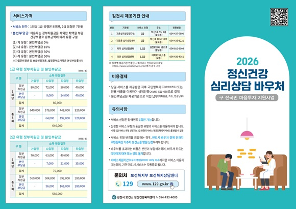 황훈정 김천시 보건소장은 “정신건강 문제는 개인의 의지만으로 해결하기 어려운 영역인 만큼, 누구나 부담 없이 도움을 받을 수 있는 제도적 장치가 중요하다.”라며, “심리상담 바우처 사업을 통해 시민들이 적절한 시기에 전문적인 상담을 받을 수 있도록 지속적으로 지원하겠다.”라고 말했다. 자세한 사항은 김천시보건소 정신건강복지센터(☎054-433-4005)로 문의하면 안내받을 수 있다.