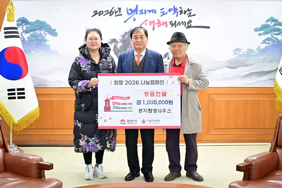 김천시(시장 배낙호)는 지난 28일, 꽁지환경늬우스(대표 이재용)로부터 희망2026나눔캠페인 성금 100만 원을 전달받았다고 밝혔다.