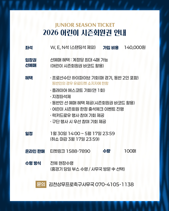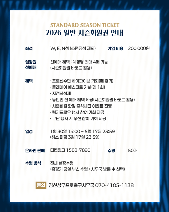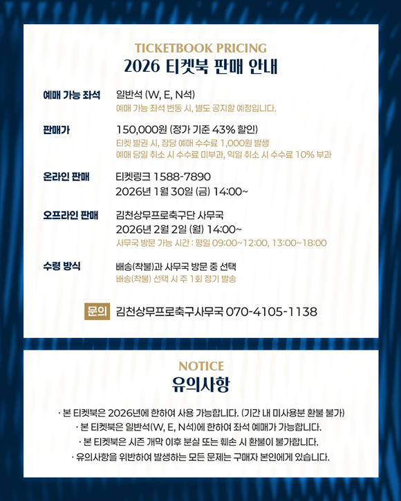 한편, 김천상무의 2026시즌 홈 개막전은 2월 28일 포항스틸러스와의 ‘하나은행 K리그1 2026’ 1R 경기다.