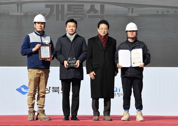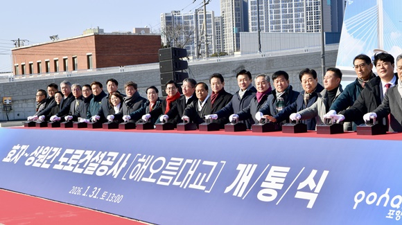 경상북도(도지사 이철우)는 31일 포항시 남구 송도동에서 북구 항구동을 잇는 해상교량(해오름대교) 건설사업인‘효자~상원 간 도로건설공사’개통식을 개최했다. 이철우 도지사, 김정재․이상휘 국회의원, 경북도의회 지역 도의원과 주민 등 300여 명이 행사에 참석했다.