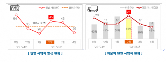 □ 최근 3년간(’23~’25년) 2월 교통사고 사망자는 45명(3년 합계)으로 상반기 최다이며, 화물차 원인 사망자는 25명(3년 합계)으로 전체의 56%를 차지한다.
