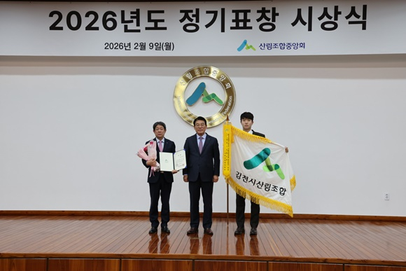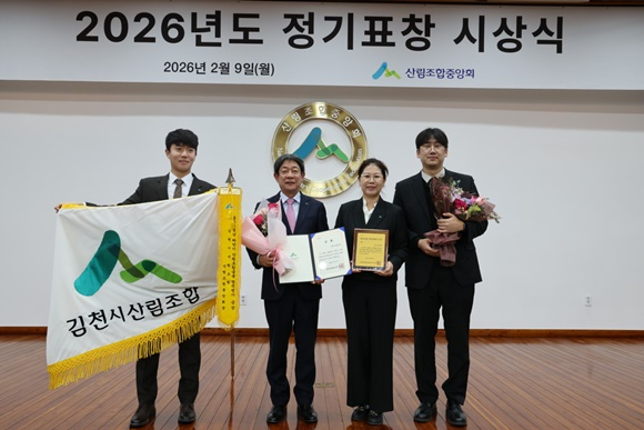 김천시산림조합(조합장 이도희)은 2026. 02. 09.(월) 13시 30분 산림조합중앙회(9층 대회의실)에서 열린 “2026년 정기총회 표창 시상식”에서2025년 하반기 산림조합 상호금융 업적평가 금상을 수상하는 영광을 차지하였다.
