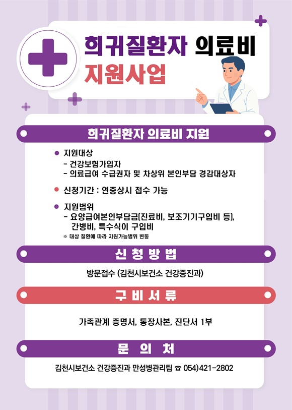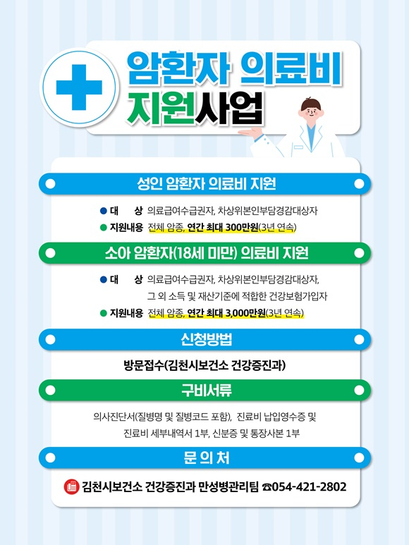 김천시는 암과 희귀질환으로 투병 중인 저소득층 시민들을 위해 「암환자·희귀질환자 의료비 지원사업」을 연중 상시 운영하며 시민 건강 증진에 앞장서고 있다.