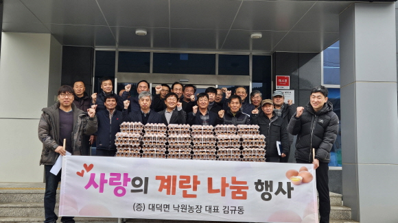 이번에 기부된 달걀은 대덕면 경로당 33개소에 배부될 예정으로 어르신들의 영양개선과 건강 증진에 도움이 될 것으로 기대된다. 김규동 대표는 평소 지역사회 이웃과 함께 살아가는 사랑의 봉사활동과 나눔의 가치를 실천하는 데 앞장서 왔으며, “지역사회로부터 받은 사랑을 조금이나마 돌려드리고 싶었으며, 작은 나눔이지만 지역사회에 따뜻한 힘이 되길 바란다.”라고 말했다. 달걀을 전달받은 전정식 대덕면 분회 노인회장은 “경로당을 찾는 어르신들에게 영양가 높은 건강한 식재료 지원으로 따뜻한 나눔을 지속적으로 실천하고 있는 김규동 대표에게 깊이 감사드린다.”라고 인사를 전했다. 홍영기 대덕면장은 “매년 경로당을 찾는 어르신들을 위해 따뜻한 사랑의 나눔을 실천해 주신 데 감사드리며, 앞으로도 지역사회와 함께하는 나눔과 봉사활동에 앞장서주시길 바란다.”라고 전했다.