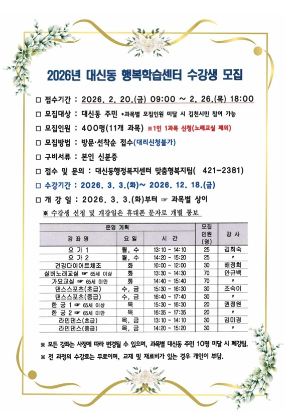 김천시 대신동(동장 이해정)은 2026년 대신동 행복학습센터 프로그램을 3월 3일 개강해 12월까지 운영한다고 밝혔다.