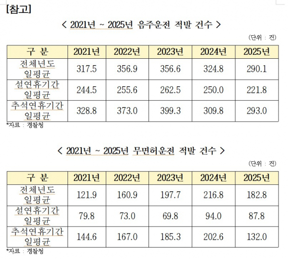 경찰청에서 제출한 음주·무면허 운전 적발건수 자료에 따르면, 2025년 음주운전 적발 건수는 일평균 290.1건으로 집계됐다. 그러나 같은 해 추석 연휴 기간 음주운전 적발 건수는 일평균 293.0건으로, 연중 평균을 웃돌았다. 반면 설 연휴 기간 음주운전 적발은 일평균 221.8건으로, 추석에 비해 크게 낮은 수준을 보였다.