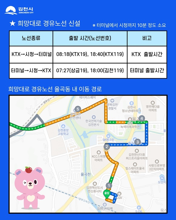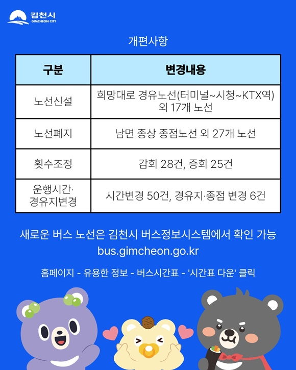 시는 이번 개편으로 대규모 노선 조정이 이루어지는 만큼, 혼선을 방지하기 위해 버스를 이용하는 시민들은 반드시 ‘김천시 버스정보시스템(bus.gimcheon.go.kr)’이나 시청 홈페이지를 통해 변경된 운행 시간표를 사전에 확인할 것을 당부했다. 시 관계자는 “이번 노선 개편은 희망대로 경유 노선 신설 등 주요 거점 간 연결성을 극대화하고 변화하는 교통 환경에 능동적으로 대응하기 위한 조치”라며, “앞으로도 시민들의 목소리에 귀 기울여 더욱 편리하고 효율적인 대중교통 서비스를 제공하는 데 최선을 다하겠다.”라고 말했다.