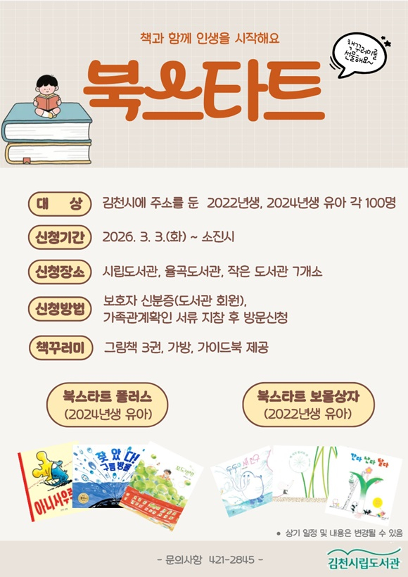 북스타트 운동이란 ‘책과 함께 인생을 시작하자’라는 취지의 지역사회 독서문화 운동으로, 영유아에게는 그림책 꾸러미를 선물하고 부모에게는 가이드북을 지급하여 가정에서 책 읽기 문화를 확산하고 가족 모두가 도서관을 활발히 이용할 수 있도록 유도하는 것에 목적이 있다. 올해 북스타트 신청대상은 김천시에 주소를 둔 2022년생 유아 100명, 2024년생 유아 100명이며 보호자 신분증과 가족관계 확인서류(주민등록등본, 건강보험증 등)를 지참해 시립도서관, 율곡도서관, 작은도서관에 방문하여 신청하면 책꾸러미가 지급된다. 해당 가정은 연령별로 선정된 그림책 3권, 가이드북이 담긴 가방을 받을 수 있다. 이신기 시립도서관장은 “이번 북스타트 사업이 아기와 보호자가 책으로 교감하는 계기가 되길 바라며, 가정 내 자연스러운 독서 습관 형성으로 도서관 이용이 활성화되길 기대한다.”라며 많은 관심과 참여를 당부했다. 북스타트 관련 자세한 사항은 시립도서관 누리집(www.gcl.go.kr)을 참고하거나 운영팀(☎421-2845)에 문의하면 된다.