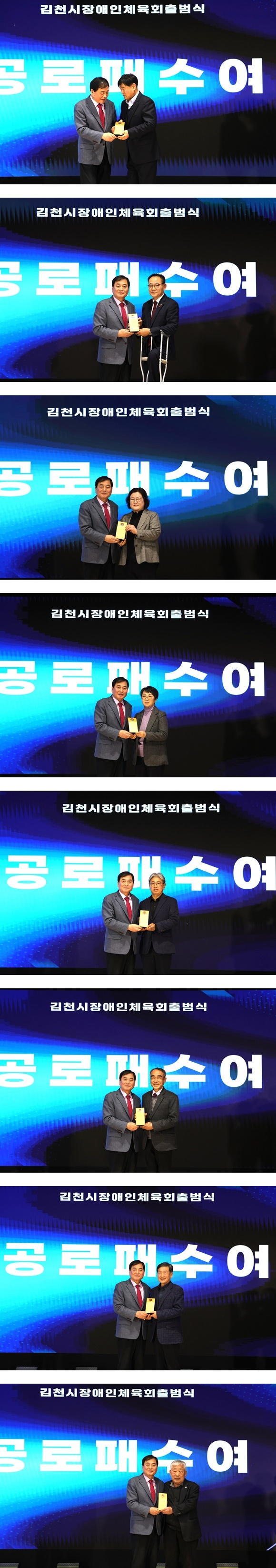 이와 함께 김천시 장애인체육 발전에 기여한 공로로 김동현 부회장, 김상돈 이사, 김혜영 경북여성문화예술인연합회 김천시지부장, 윤안숙 (사)경북장애인부모회 김천시지부장, 이만수 우천냉면 대표, 김길영 (사)경북지체장애인협회 김천시지회장, 김재경 (사)경북지적발달장애인복지협회 김천시지부장, 맹점수 (사)한국교통장애인협회 경북협회 김천시지회장, 김상섭 새김천새마을금고 이사장이 공로패를 받았다.
