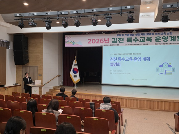 경상북도김천교육지원청(교육장 모태화)은 26일(목) 김천학생문화예술센터에서 관내 유·초·중·고등학교 특수교사 및 특수교육 업무담당자 70명을 대상으로 ‘2026 김천 특수교육 운영계획 설명회’를 개최하였다.