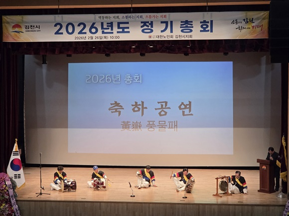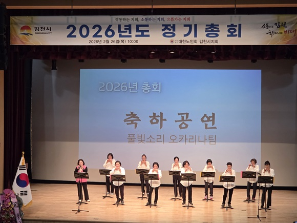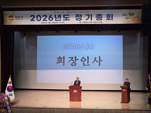 대한노인회 김천시지회는 2월 26일(목) 김천문화회관 대공연장에서 경로당 회장 및 관계자 등 300여 명이 참석한 가운데 2026년 정기총회를 개최했다.