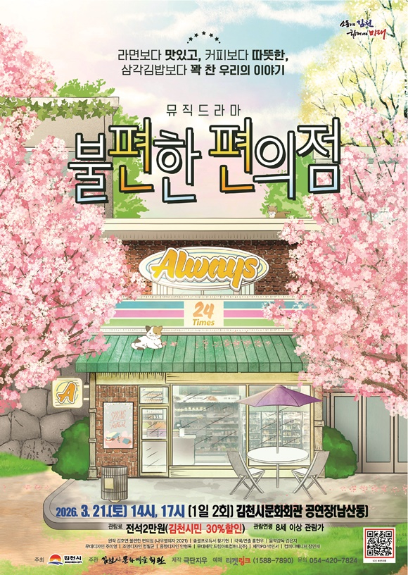 연극 <불편한 편의점>은 동명의 밀리언셀러 소설을 원작으로, 편의점을 배경으로 각기 다른 사연을 가진 인물들이 일상을 나누며 관계를 회복해 가는 과정을 담은 작품이다. 해당 작품은 대학로에서 장기간 공연되며 작품성과 대중성을 동시에 인정받았고, 전국 투어 공연에서도 매진 사례를 기록하는 등 관객 반응이 우수한 연극으로 평가받고 있다. 특히, 현실적인 대사와 친숙한 공간, 세대 간 공감이 가능한 인물 구성으로 가족 단위 관객은 물론 중장년층까지 폭넓게 즐길 수 있는 공연이다. 예매는 3월 6일 14시부터 티켓링크 또는 김천시문화예술회관 누리집에서 가능하며 김천시민은 30% 할인을 받을 수 있다. 자세한 사항은 김천시 문화예술회관 누리집 공지사항을 확인하거나, 문화예술회관 사무실로 문의하면 된다. 문의) ☎ 054-420-7824, 누리집 https://www.gc.go.kr/gcart
