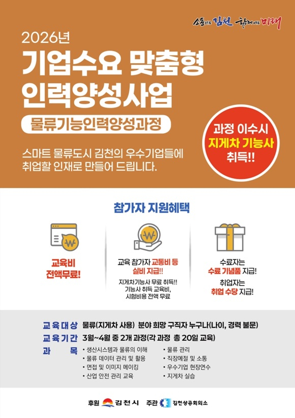 이번 과정은 스마트 물류도시로 거듭나고 있는 김천시의 산업 구조 변화에 대응하고, 물류 일자리에 맞춤형 인력 양성과 취업연계를 통해 산업 경쟁력을 제고하기 위해 매회 15명씩 총 30명의 교육생을 모집해 진행될 계획이다.