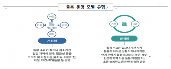 거점형 돌봄기관은 아침․저녁․토요일․휴일․방학 등 돌봄 취약 시간대에 해당 기관 재원 유아뿐만 아니라 인근 유치원과 어린이집 유아까지 포함한 돌봄 서비스를 제공하는 방식으로 운영된다.