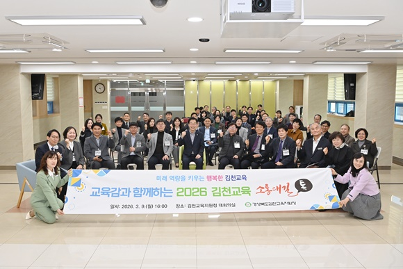 경상북도김천교육지원청(교육장 모태화)은 3월 9일(월) 대회의실에서 관내 각급 학교장 대표단, 학교운영위원장협의회장, 학부모회협의회장, 녹색어머니회장, 학부모자원봉사자회장, 주민감사관, 민원제도개선협의회장, 공약이행평가단, 주민참여예산위원, 교육계 원로 등 교육가족 30여 명을 초청하여 ‘2026 교육감과 함께하는 김천교육 소통대길 톡’을 개최하였다.