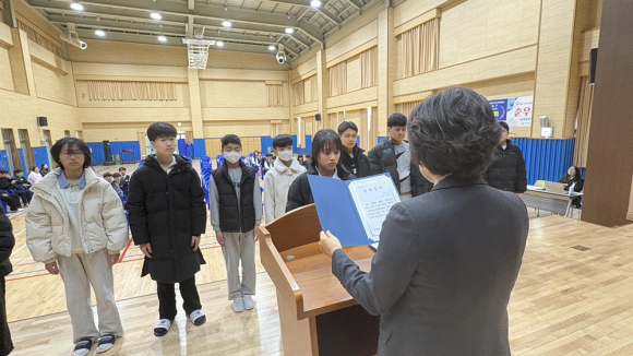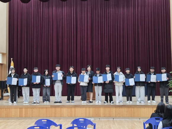 지품천중학교(교장 이명자)는 대한불교 조계종 청암사(주지 상덕스님)으로부터 학생 장학금 지원을 받아 2026학년도 입학생 14명 전원에게 장학금을 수여하였다. 이번 장학금은 학업에 성실히 임하고 새로운 학교 생활을 시작하는 학생들에게 격려와 응원의 의미로 전달되었다.