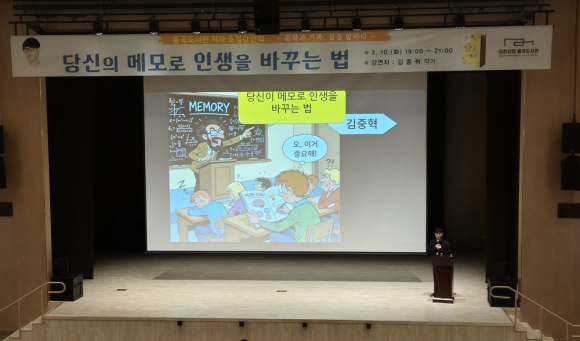 율곡도서관은 지난 3월 10일 오후 7시 율곡홀에서 김천 출신 소설가 김중혁 작가를 초청해 ‘당신의 메모로 인생을 바꾸는 법’을 주제로 저자 초청 강연회를 개최했다.