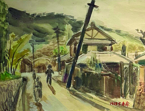 그림을 면밀히 관찰해 본다. 우측 아래에 “1939. 5. 壽命”이란 사인이 들어 있다. 김천국민학교로 갓 부임해 온 그가 해거름의 어느 거리와 뒷산을 그린 종이 수채화, 아마 김천 남산동에서 고성산 발치의 노실고개로 닿는 어느 거리의 풍경인 것 같다. 얼핏 보면 서투른 작품 같으나 작품이 나타내고자 한 시대적 배경과 정황를 더 깊이 추적해 보자. 투명함을 강조하는 수채화에서의 관례를 벗어나 과감하게 무채식과 어두운 색을 사용했는데 이는 일제강점기 말, 군국시대의 암울과 개인의 심적 고독을 투사한 것으로 해석 된다.