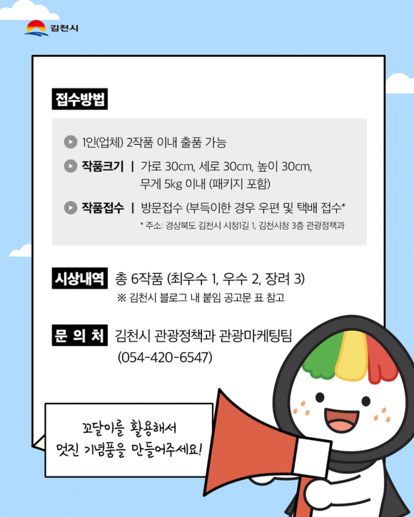 박미정 관광정책과장은 “이번 공모전을 통해 관광객들에게 소장 가치가 높은 차별화된 기념품을 선보임으로써, 김천김밥축제 캐릭터 꼬달이의 IP 자생력이 강화될 것으로 기대된다.”라고 말했다. 한편, 공모전 접수는 5월 13일부터 5월 15일까지 3일간 방문 또는 우편으로 가능하며, 자세한 내용은 김천시청 누리집에서 확인할 수 있다.