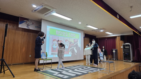 김천동신초등학교(교장 한인기)는 지난 13일(금), 본교 시청각실에서 3학년 학생 56명을 대상으로 ‘찾아가는 교통안전교육’을 실시하였다.