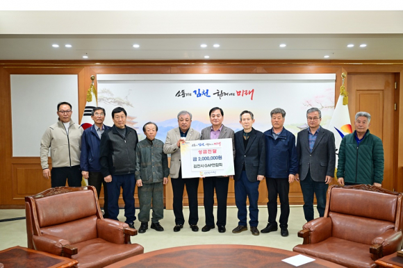 김천시GAP연합회는 우리 지역의 농산물우수관리(GAP) 인증 농가들로 구성되어 안전한 농산물을 생산하고, GAP 인증 확대와 농가 소득 증대를 위해 노력하는 단체이다. GAP 인증은 농산물의 안전성을 확보하고 농업 환경을 보호하기 위해 농산물의 생산, 수확 후 관리, 유통 전 과정에서 농약, 중금속, 미생물 등 위해 요소를 관리하는 제도이다. 안종복 회장은 “올해도 회원들의 뜻을 모아 우리 주변의 어려운 이웃들을 위한 성금 전달에 함께하게 되었다.”라며, “우리의 노력과 정성이 도움이 되어 소외계층에 희망이 될 수 있기를 바란다.”라고 전했다.