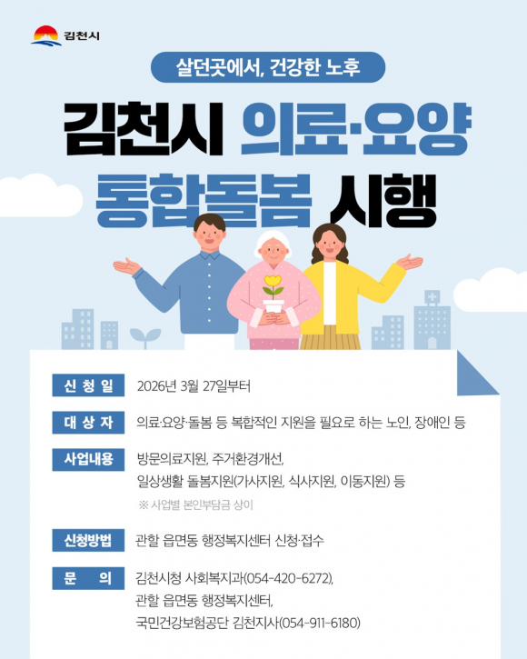 김천시는 이번 선포식을 계기로 의료, 요양, 일상생활 지원, 주거 환경 개선 등을 연계한 지역 기반 돌봄 체계를 단계적으로 확대해 시민들이 살던 곳에서 안정적인 삶을 이어갈 수 있도록 지원할 계획이다.