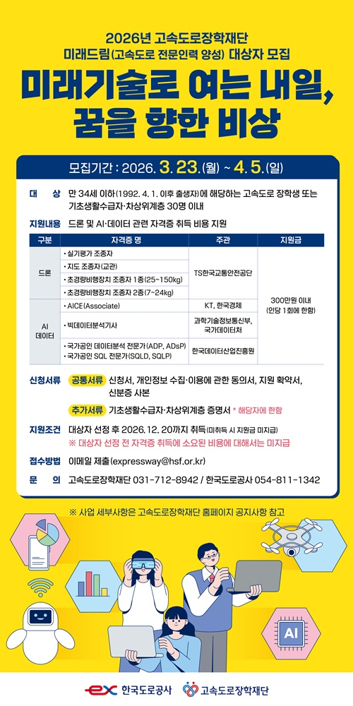 한국도로공사(사장직무대행 이상재)와 고속도로장학재단은 청년들의 미래 역량 강화를 위해 ‘2026년 미래기술 자격취득 지원사업’ 대상자를 3월 23일(월)부터 4월 5일(일)까지 모집한다고 밝혔다.