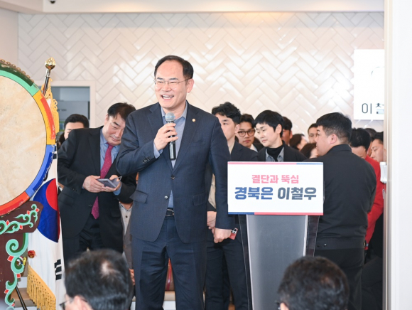 먼저 송언석 국민의힘 원내대표는 “우리 이철우 지사님께서 그동안의 지역 발전을 위해서 또 대한민국의 성공을 위해서 많이 애쓰셨다”면서 “오늘 이 자리가 국민의힘이 다시 한번 비상할 수 있는 계기가 되기를 강력하게 희망한다”고 말했다.